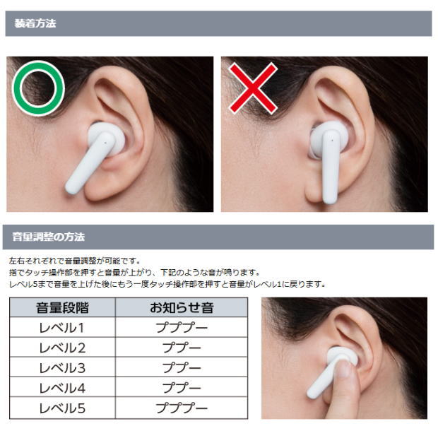 音量調整は左右それぞれで調整が可能。指でタッチ操作部を押すと音量が上がり、下記のような音が鳴ります。レベル5まで音量を上げた後にもう一度タッチ操作部を押すと音量がレベル1に戻ります。