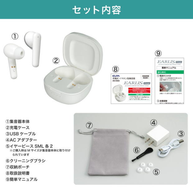 USBケーブル、ACアダプター、イヤーピースSML各2 ※ご購入時はMサイズが集音器本体に取り付けられています クリーニングブラシ、収納ポーチ、取扱説明書、簡単マニュアル |