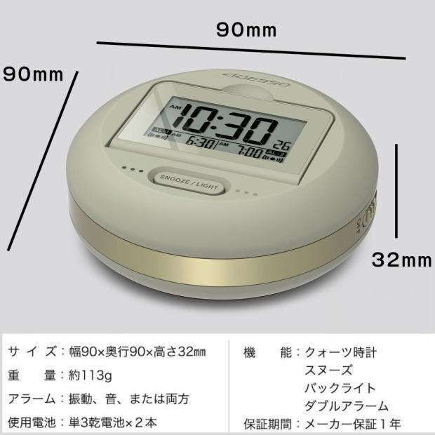 | 機能 | クオーツ、ダブルアラーム(80デシベル)、スヌーズ、バックライト、アラームの種類(振動アラーム+音アラーム、またはどちらか) |