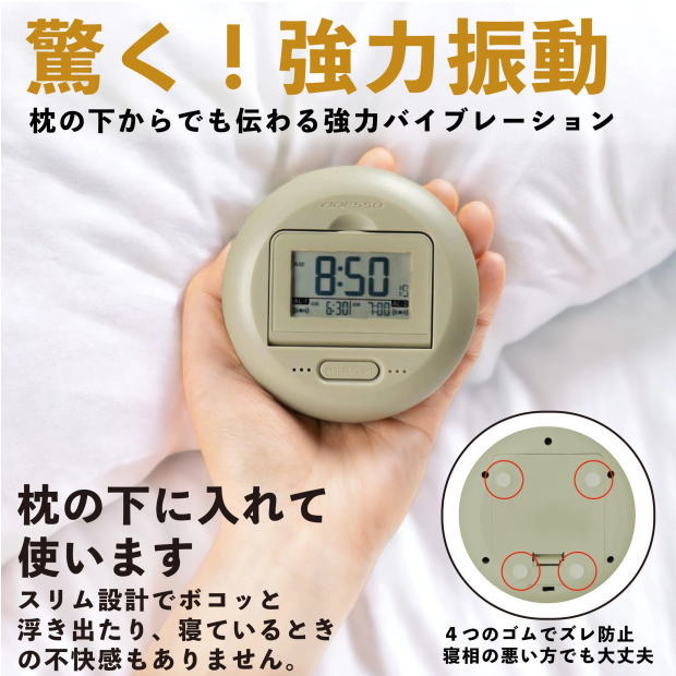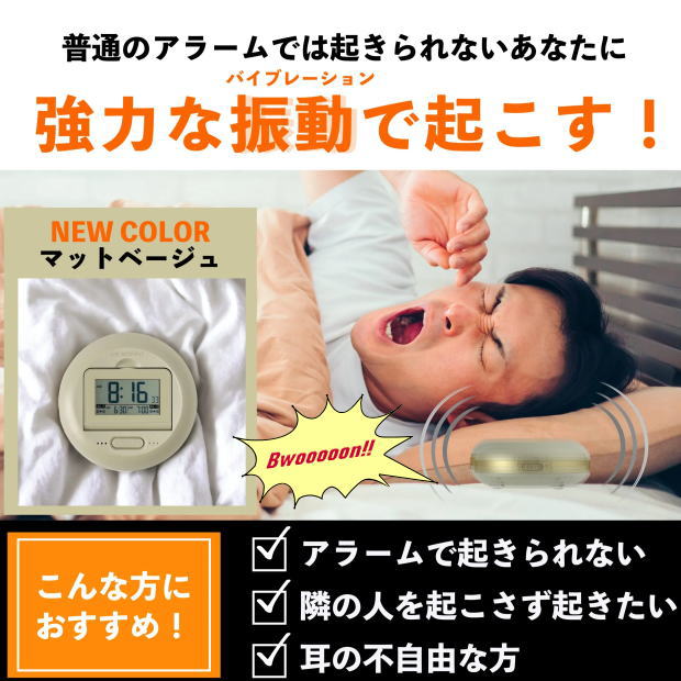 「振動式目覚まし時計」はアラーム音だけでは起きられない方や、大音量の目覚まし時計が苦手な方、同室の家族や隣人を起こしたくない方、耳の不自由な方に最適な解決策です。