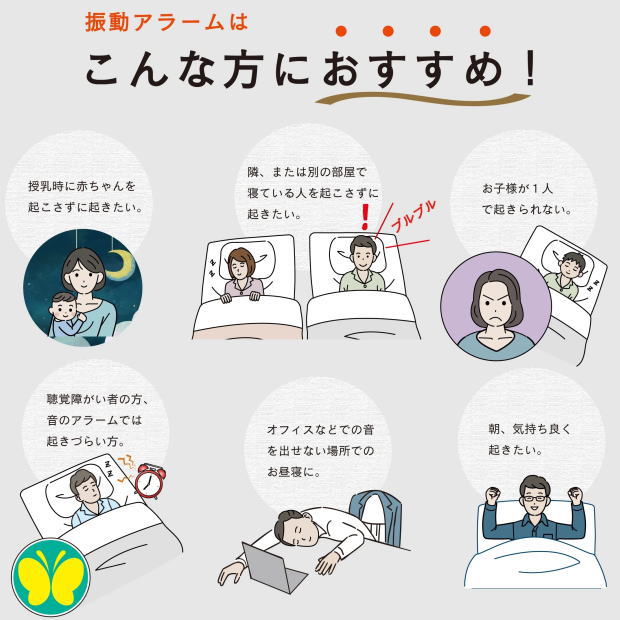 例えば、夜勤がある方や朝練で兄弟より早く起きる方は、振動でスムーズに目覚め、ほかの家族を起こす心配もありません。