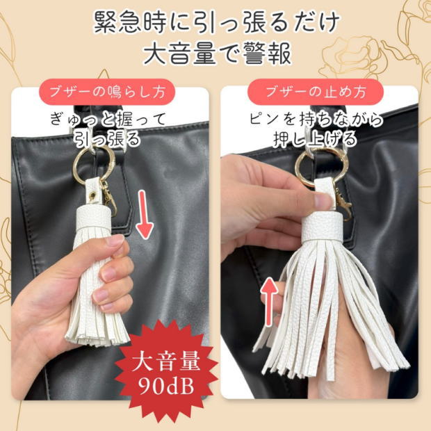 チャームを握り、強く握り引っぱるだけで、大音量のブザーが鳴ります。