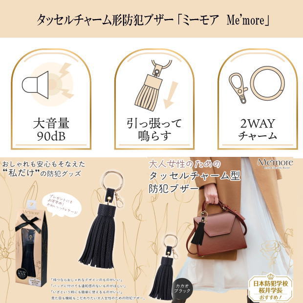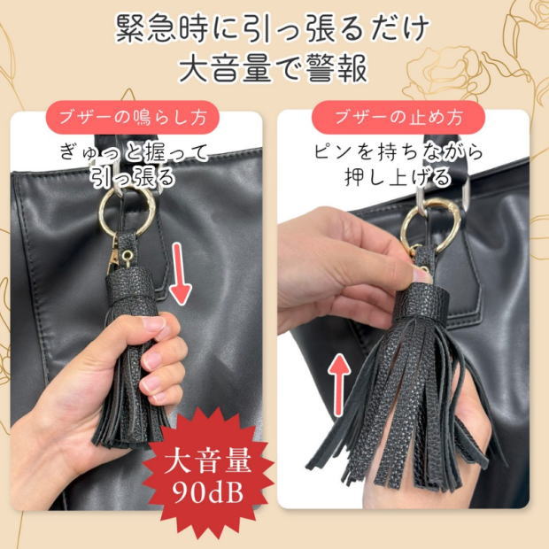 「バッグに付けても違和感のないものが欲しい」「おしゃれなデザインのブザーがあるといい」といった声から生まれた大人女性の為の防犯ブザー。どのようなバッグにも合うデザインです。