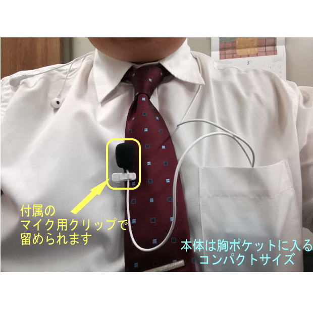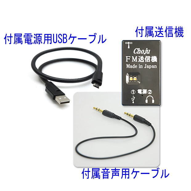 | 付属品 | FM送信機、音声用ケーブル、電源用USBケーブル、イヤホン(両耳モノラル、コード約60㎝)、イヤーピース(大・中・小)、マイク(コード約35㎝)、マイク用クリップ、調整用ドライバー(本体内に収用)、単4アルカリ乾電池、 |