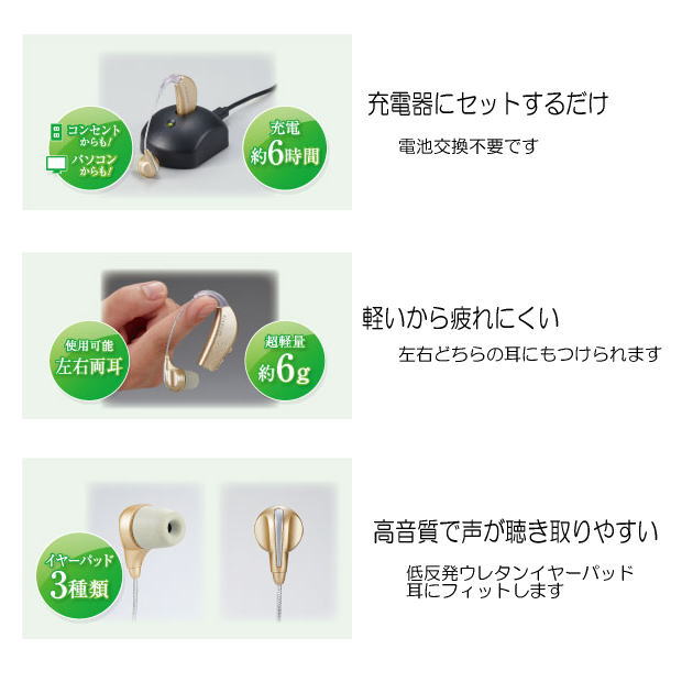 ①電源を入れます ②耳に装着します ③3段階の音量調節