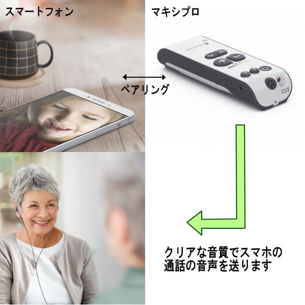 スマートフォンのBluetoothを有効にして、マキシプロとペアリングするだけで、スマホの通話の音量を大きくして聴き取りやすくできます。