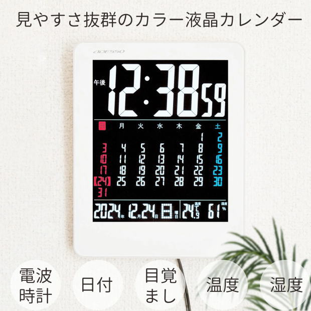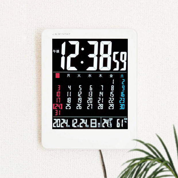 大きな画面で時刻、日付、曜日が見やすい!時刻・日付・温度・湿度・カレンダーを一度に確認できます。