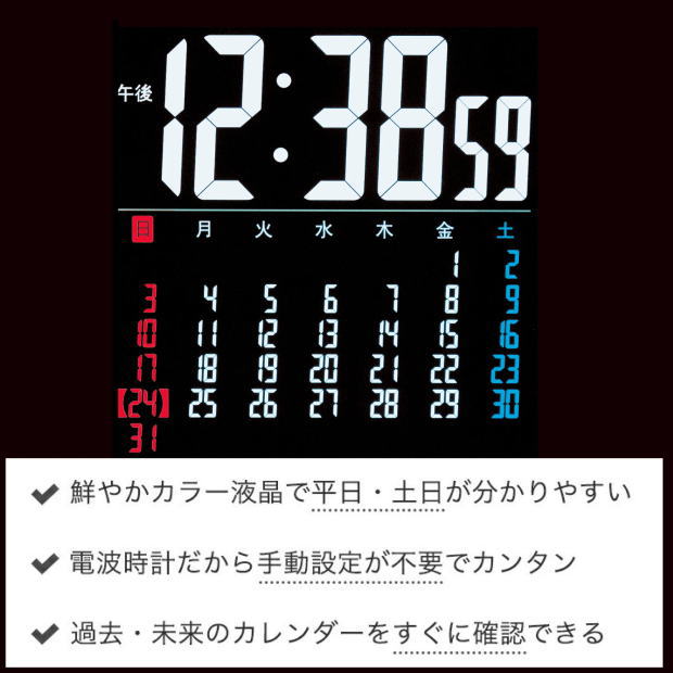 紙のカレンダーと違い、自動で表示が変わります。電波時計だから正確な日付と時刻を表示します。