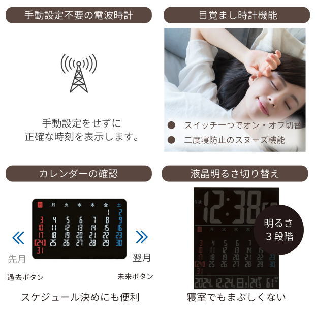 | 機能 | 電波時計 、カレンダー表示 、日付表示 、アラーム、 スヌーズ、温湿度表示、 明るさ切り替え(3段階)、 置き掛け兼用 |