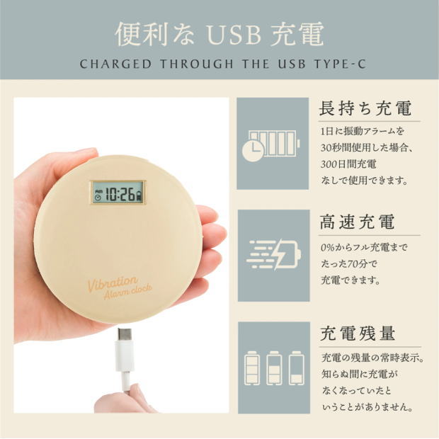 クオーツ アラーム(76デシベル) スヌーズ バックライト 振動アラーム+音アラーム、またはどちらか 充電残量アイコン 12/24時間制切替 フル充電から約300日間使用可能(毎日30秒間振動アラームのみ使用の場合) ※充電切れになるとすべての設定がリセットされます。 |