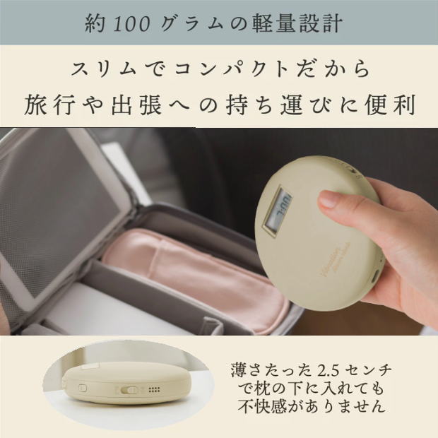 直径9センチ、重さ104グラムの持ち運びやすいサイズ感は、出張や旅行、外出時の仮眠などにぴったり。