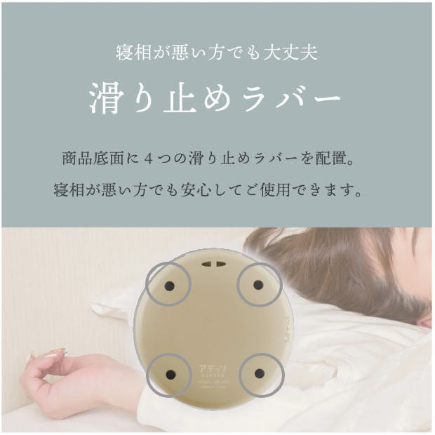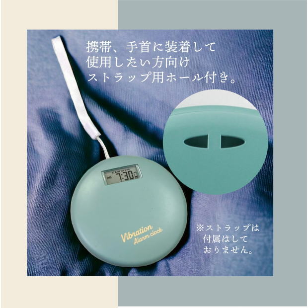 本体の底面には滑り止めのラバー、携帯や手首に装着したい方向けのストラップ用ホールが付いているため、寝相の悪い方も安心です。(ストラップは付属しません。)