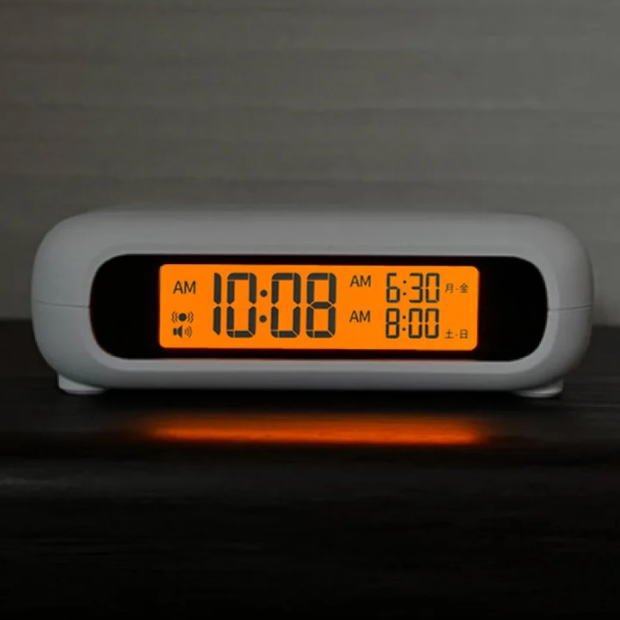 液晶画面の手前にあるボタンを押すと、オレンジ色のLEDでバックライトが点灯します。夜間や、暗い場所でも時刻表示が見やすく便利です。