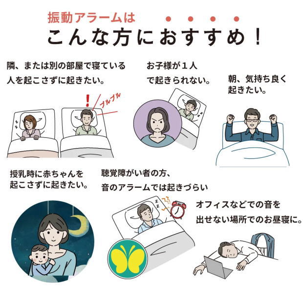 「振動式目覚まし時計」はアラーム音だけでは起きられない方や、大音量の目覚まし時計が苦手な方、同室の家族や隣人を起こしたくない方、耳の不自由な方、そして、従来の振動式目覚まし時計では起きられない方にも最適な解決策です。