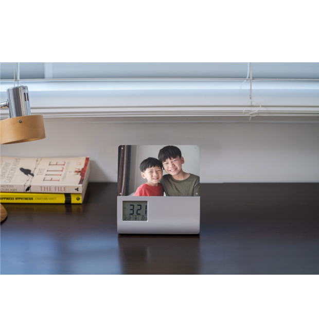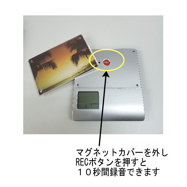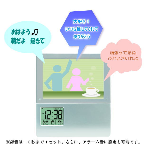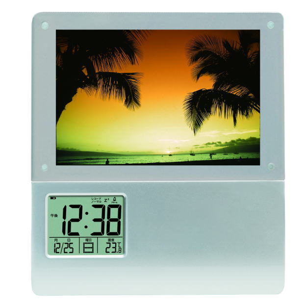 | 機能 | クオーツ 、日付表示 、温度表示 、アラーム 、スヌーズ 、音声録音機能(10秒間アラーム音に設定可)、写真サイズ100mm x 150mm |