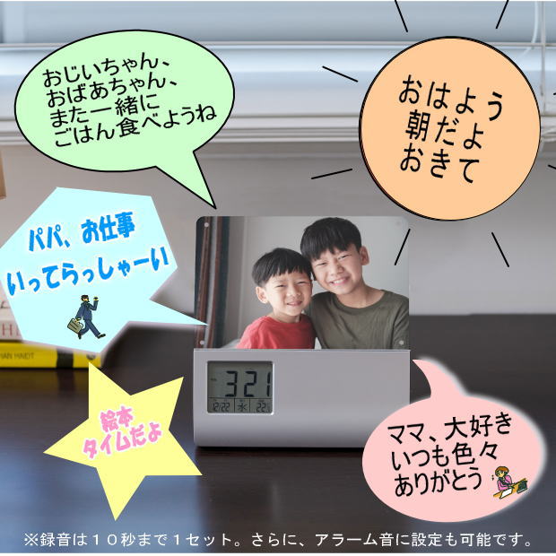 お好きな音源を10秒間録音して、「世界にひとつだけの自分好みの音声付きフォトフレーム」としてお楽しみいただけます。