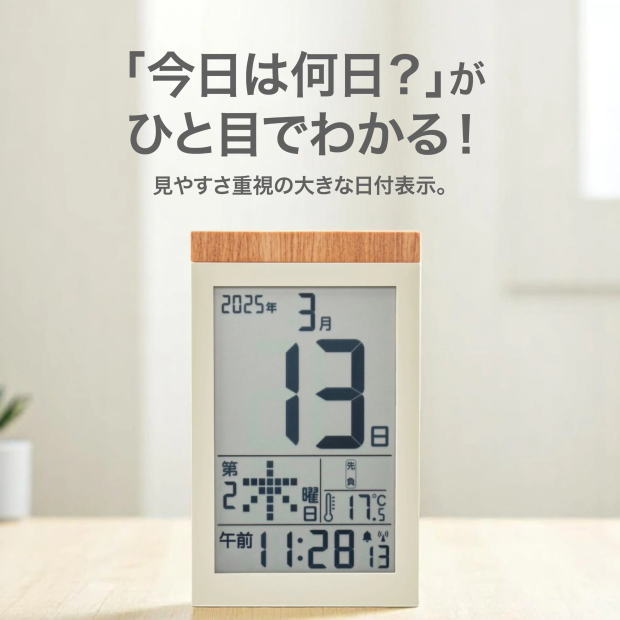 大きい日付が見やすいカレンダー表示がメインの電波時計です