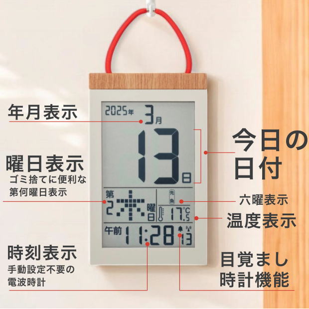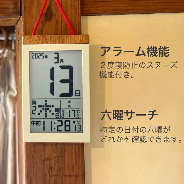 | 機能 | 電波時計、日付表示、第何曜日表示、六曜表示、アラーム・スヌース機能、温度表示、記念日設定 |