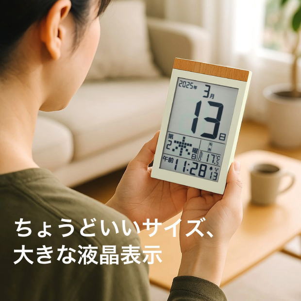 大きな画面で時刻、日付、曜日が見やすい!日付を忘れてしまう、家族に聞いてしまうなどのお悩みを解決。いつでも自分で確かめられるので安心して生活できるようになります。