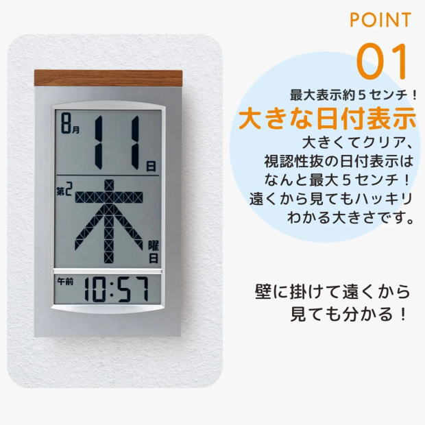 遠くからでも一目で分かる曜日搭載のカレンダー付の電波時計