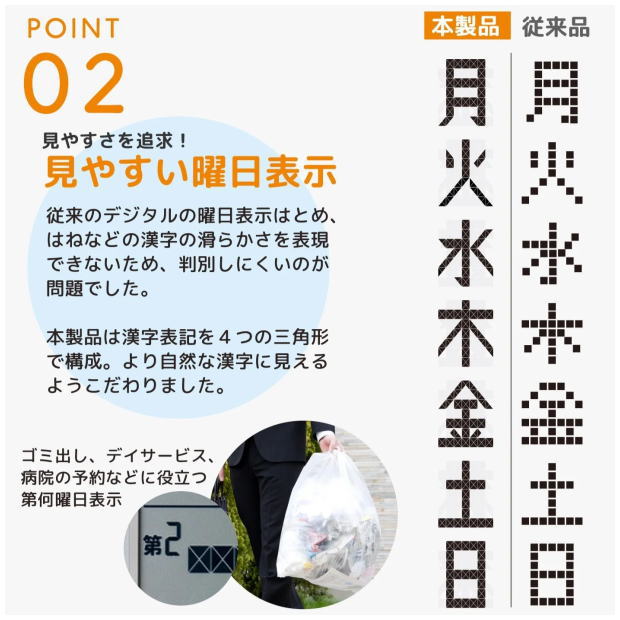 第何曜日の表示付きです。例えば、第2火曜日は不燃物、第3火曜日はビンやカンという風にゴミ出しの分別を分かりやすくします。