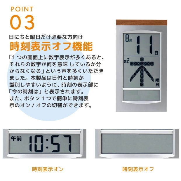 「1つの画面上に数字表示が多くあると、 それらの数字が何を意味 しているか分からなくなる」 という意見を元に、日付さえ分かればいいという方向けに、ボタン1つで簡単に時刻表示のオン/オフの切替ができます。
