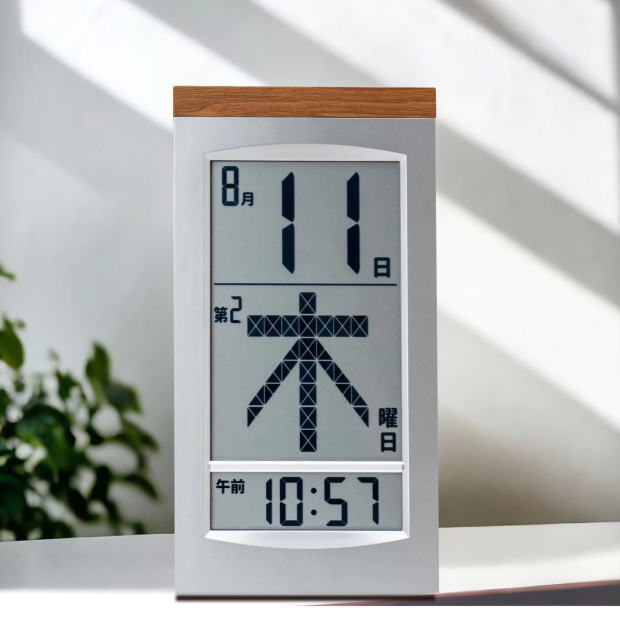 今日が何日・何曜日なのかがすぐにわかる、日めくりカレンダー感覚でお使い頂ける電波時計です