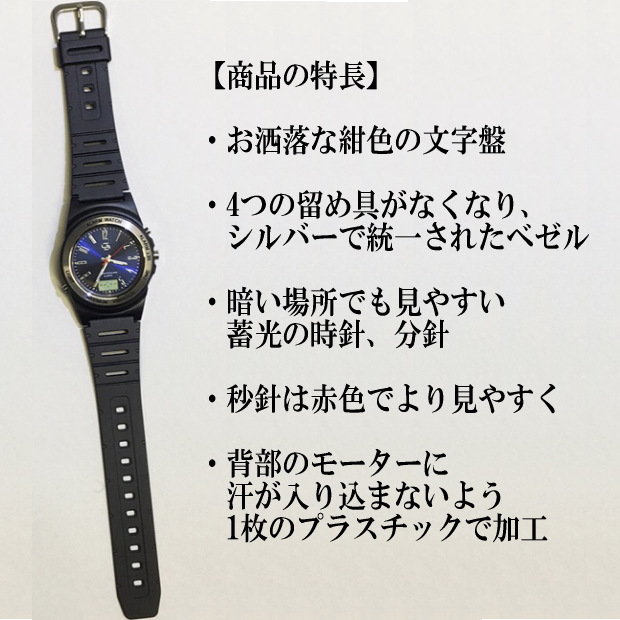 文字盤はおしゃれな紺色とし、ベゼル(文字盤の周縁部)はシルバーで統一。時針と分針に蓄光(ちくこう)塗料を搭載しています。また、秒針を赤色にすることで見やすさを改良しています。