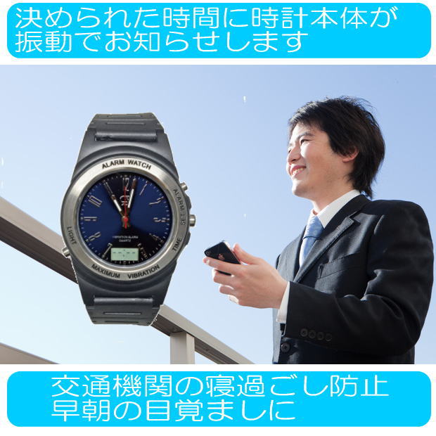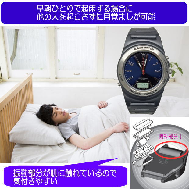 強力な振動でアラーム時刻をお伝えする振動式アラーム腕時計