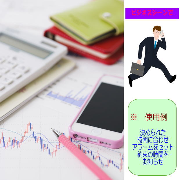 予めアラーム時刻を設定しておき、時間になると強力な振動でお知らせします。音が鳴らず、振動のみでお知らせしますので、周囲に迷惑を掛けることがありません。