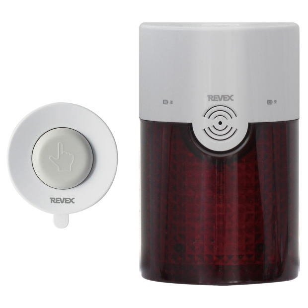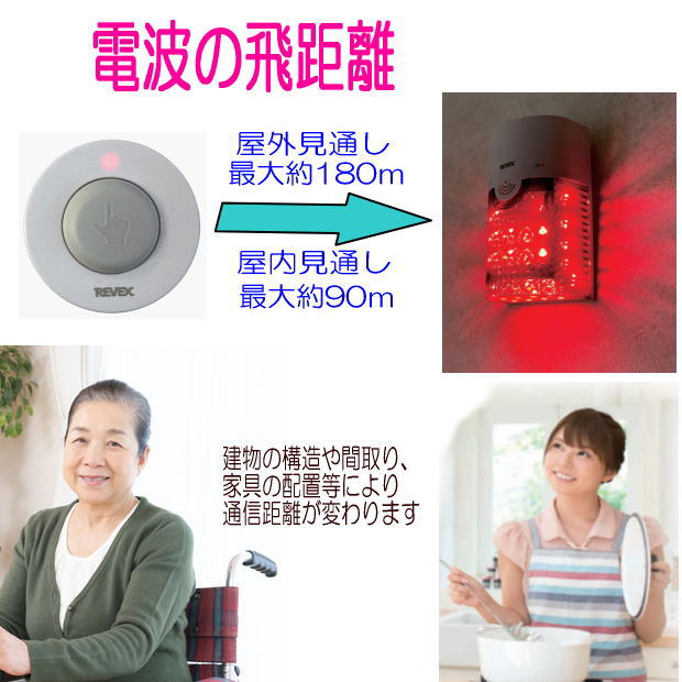 押しボタンを押すと、離れた場所にある受信機が眩しい光やチャイム音でお知らせします