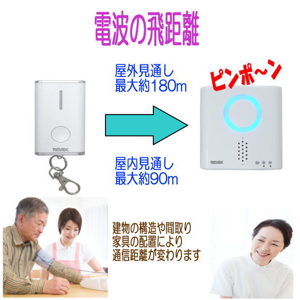 送信機の押しボタンを押すと受信機に信号を送ります。室内間の呼び出しはもちろん、電波の届く範囲内ならどこからでもお知らせが可能です。