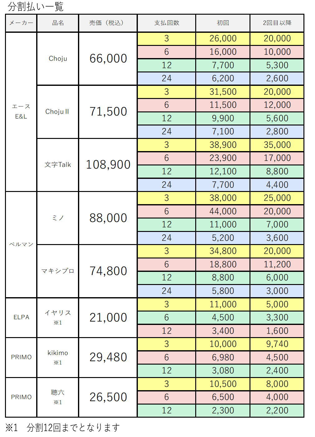 商品価格および分割回数ごとの支払総額は、商品ごとに異なります。